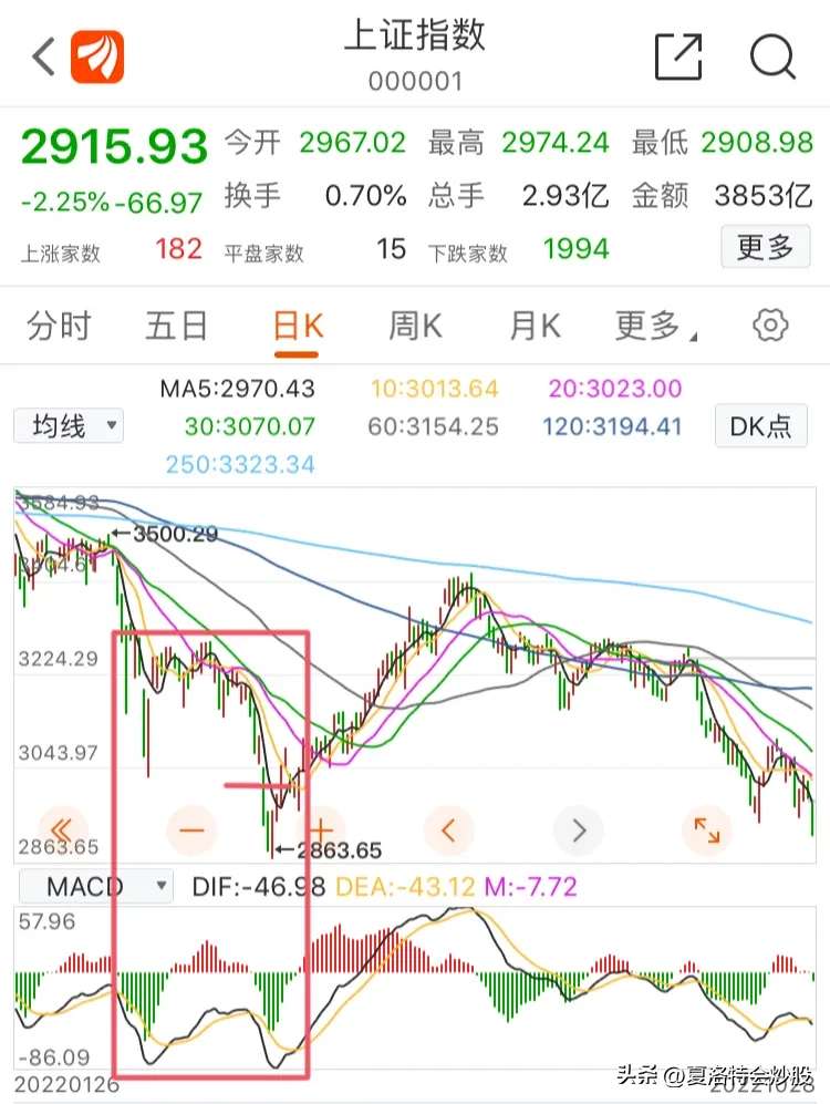 对于当前的走势,我认为和图1的情况类似,当前的底部大结构如图中红框,小位置如红线处,刚刚过了前低,但是macd的快线没有过前低,后面的低点大概率要破2863,但可以肯定的是,在3000点以下如此疯狂的杀跌,底部一定不远了,从周线来看,这里有望和2863形成双底,出现周线级别的底背离,看看道琼斯指数,就是这种走法。也许看到此处的你非常反对我的观点,口罩蔓延、rmb贬值、经济下滑、新股发行、外部动荡云云,那我要问你,2863反弹时以上问题有一样解决过吗?漂亮那边太平吗?不也强势反弹了,真正让你恐慌的,是账户亏损的数字而已,下面希望你暂且忘掉亏损的烦恼,咱们更加理智的分析一下当前的形势。