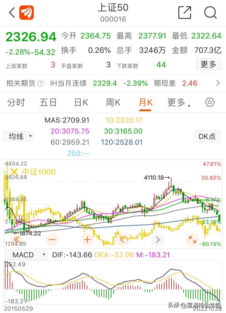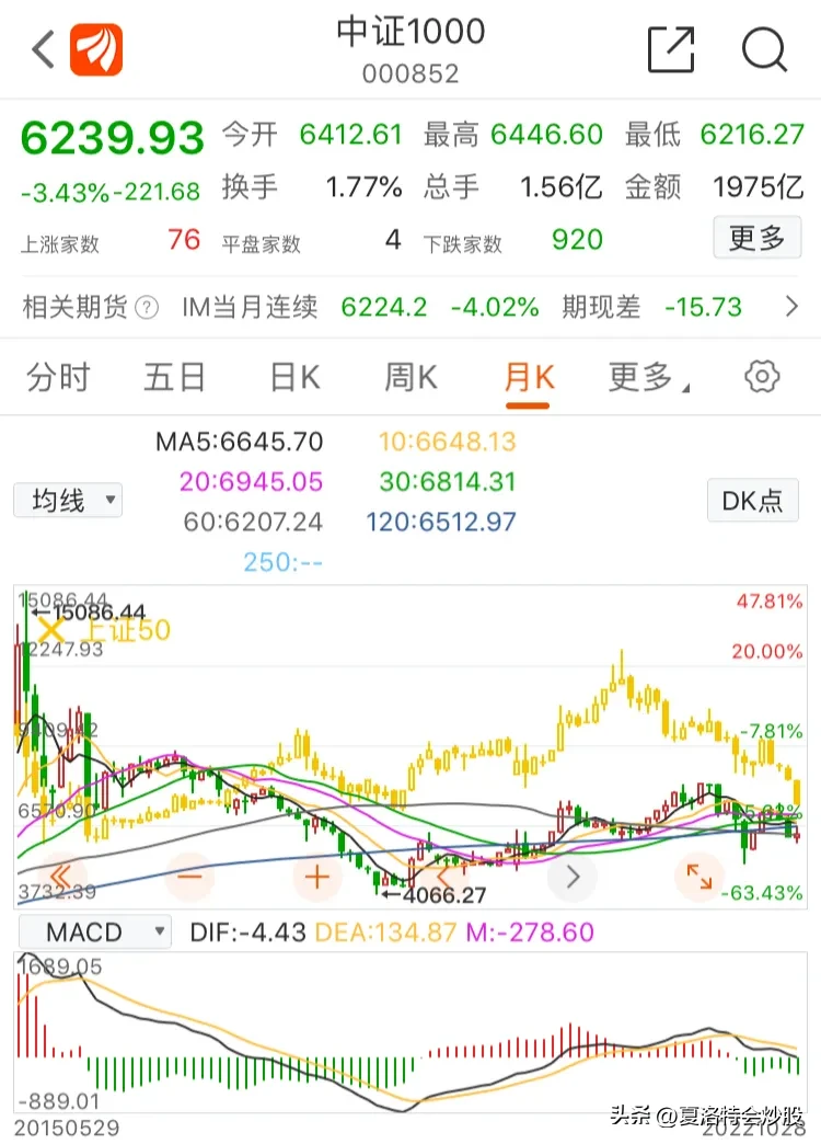 下面再看图4、5,图4是上证50的月线,可以发现已经来到了前期的底部支撑位置,而上次这个位置正式上证50的起涨点,相对于经过了近两年的调整,已经回到了超级大箱体的下沿。后面只要月线出现止跌反弹,这里就是几年内的一个底部,这个时间我猜测是11月到12月份,等刀乐开始走弱之时。而这些权重一旦起舞,指数上的反弹都是轻而易举的事情。经过了这么长时间的阴跌沉淀,里面的散户又有几人?反观图5,中证1000下周一开盘月线就要下零轴,参考前面下零轴后的走势,将开启慢慢的阴跌之路。从跷跷板效应也可以得出,未来的方向一定在大权重。