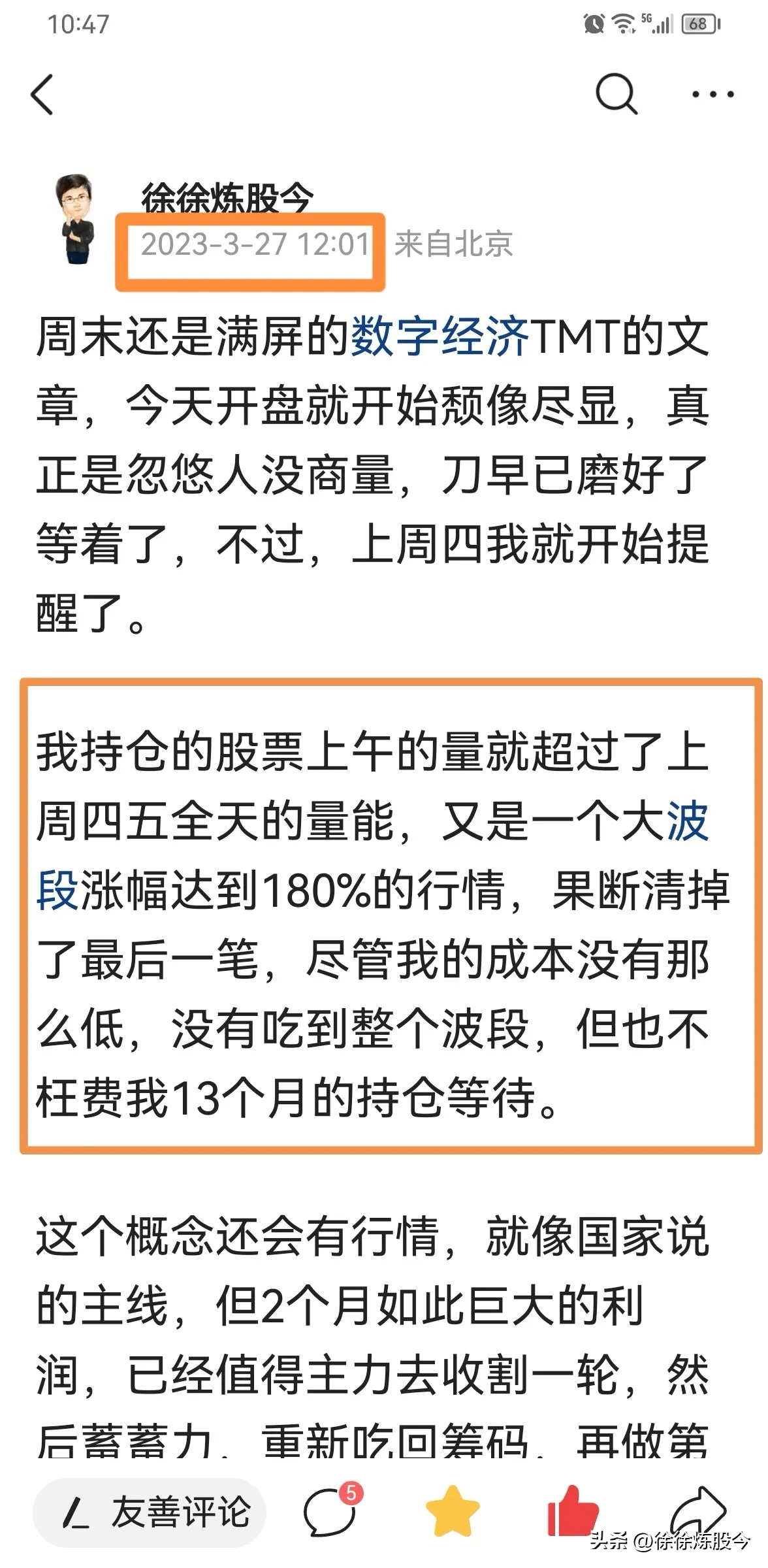 4.可惜1月31日的加仓价格打低了,没买到,同时他就开始了数字经济的行情的主升浪,唯一遗憾的是,在他2月份震荡洗盘的最后阶段,因为仓位太重,担心回撤洗盘,就减仓了部分筹码先锁定利润,这部分实属卖飞了。