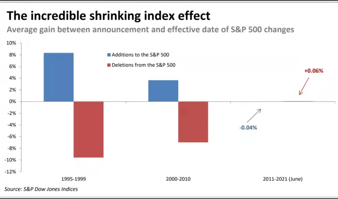 因此,当一只股票被纳入标准普尔500指数时,标准普尔500指数基金需要购买的股票与非标准普尔500指数基金需要出售的股票之间的差距并不大。同样的情况也发生在标普500指数中被删除的股票上:标普500指数基金需要出售的股票与非标普500指数基金将要购买的股票之间的不平衡比以前小得多。