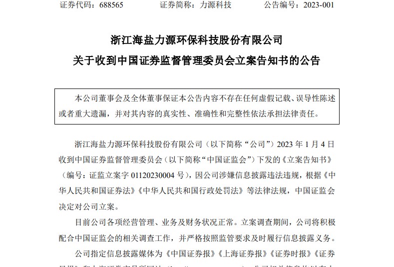 1.2023年1月5日,688565力源科技发布《关于收到中国证券监督管理委员会立案告知书的公告》称,因公司涉嫌信息披露违法违规,2023年1月4日收到中国证券监督管理委员会下发的《立案告知书》(编号:证监立案字01120230004号)。