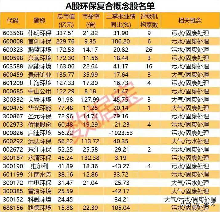 6.A股复合环保概念股有20余只,百亿市值个股仅8只,包括伟明环保、首创环保等市值超200亿元。