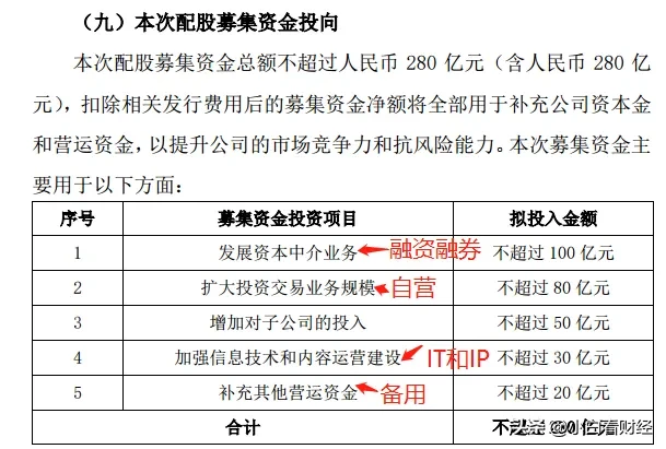 1.风口浪尖——华泰证券280亿配股融资争议继续发酵!续上面表态后,华泰也自查表示符合配股资格,至于配股的必要性和影响,双方都没提,这280亿的投向分四项:1.100亿投向资本中介业务,基本上是投向融资融券业务,华泰客户融资就需要华泰有足够的资金借给客户,华泰收取融资利息,这100亿甚至可以通过其他手段,放大杠杆提供300亿以上融资额度,这目前是券商最赚钱的业务,占券商利润的30%!2.80亿投向投资交易业务也就是自营业务,这一来可以赚钱,二来可以给融资融券业务提供足够的股票借给华泰客户做空,虽然全市场融券规模仅1000亿出头,但增长非常迅速,投资者融券需求非常大,融券利率融资高很多很多,是很赚钱的业务!3.50亿投向子公司,大概率是投向华泰资管或华泰香港!4.30亿投向IT和IP运营,华泰在IT的投入一直很大,有上千IT技术员工,虽然效果不咋样,至于IP运营,看看华泰APP就明白了,主打的涨吧比交易功能还显眼……很多投资者疑惑为什么不用账上的钱或者从银行借钱呢,而采取配股这样极端的融资方式,这涉及到证券业务的特殊性和特别的JG要求,证券公司又基本都是国资背景,配股差不多是券商可选的唯一方式,东财除外!很多投资者关心后续的进展,会不会缩减融资规模甚至直接不配股了,虽然投资者和公众的关注度很高,但华泰证券调整方案的可能性比较低,大概率还是按照原有配股方案执行,投资者左右不了!