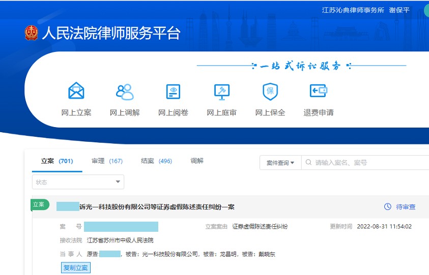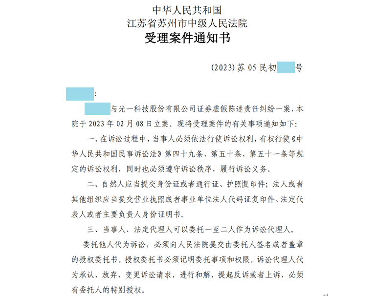 1.2023年2月9日,谢保平律师金融证券维权团队代理的一批300356*ST光一投资者收到了苏州市中级人民法院《受理案件通知书》。