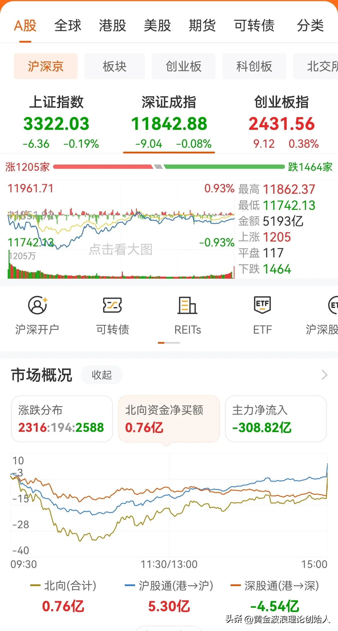 2.今日北向资金曲线全天呈现“先抑后扬”的走势,临近下午收盘,北向资金快速偷袭,从而最终使得北向资金全天净流入0.76亿,以内资为主的主力资金全天净流出308.82亿。