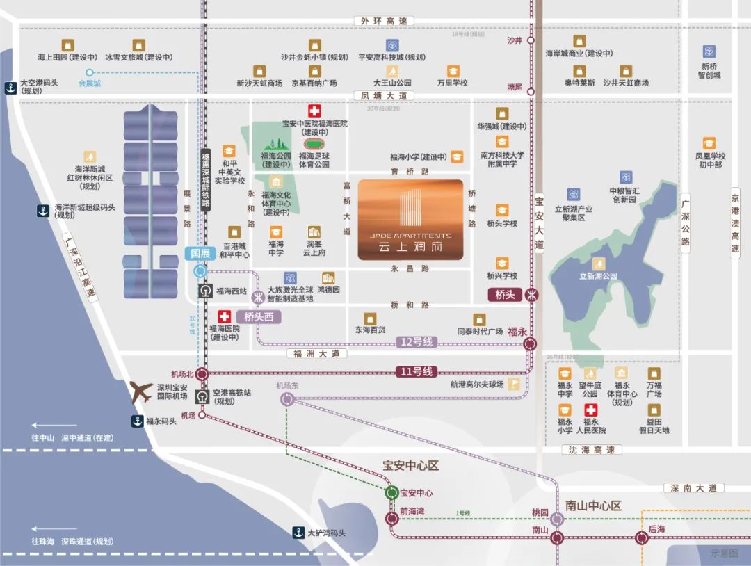 医疗生活等等家庭所需的配套上,还临近宝安中医院福海医院(规划中),该院为宝安区域重点建设项目,目前已启动国际招标;毗邻福海足球体育公园、福海文体中心(规划中),周边凤凰山森林公园、海上田园、立新湖公园及海洋新城红树林休闲区(规划中)等环绕;