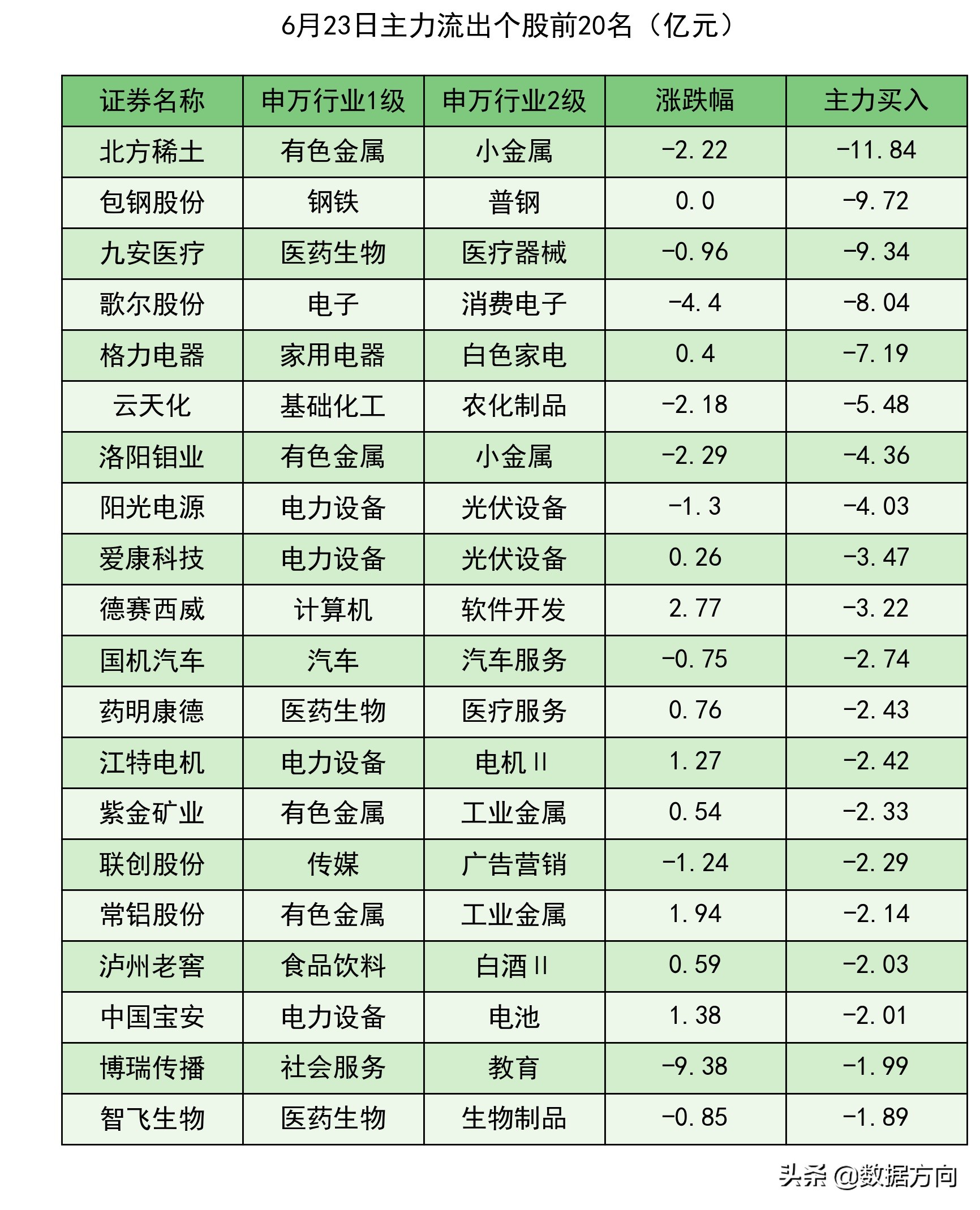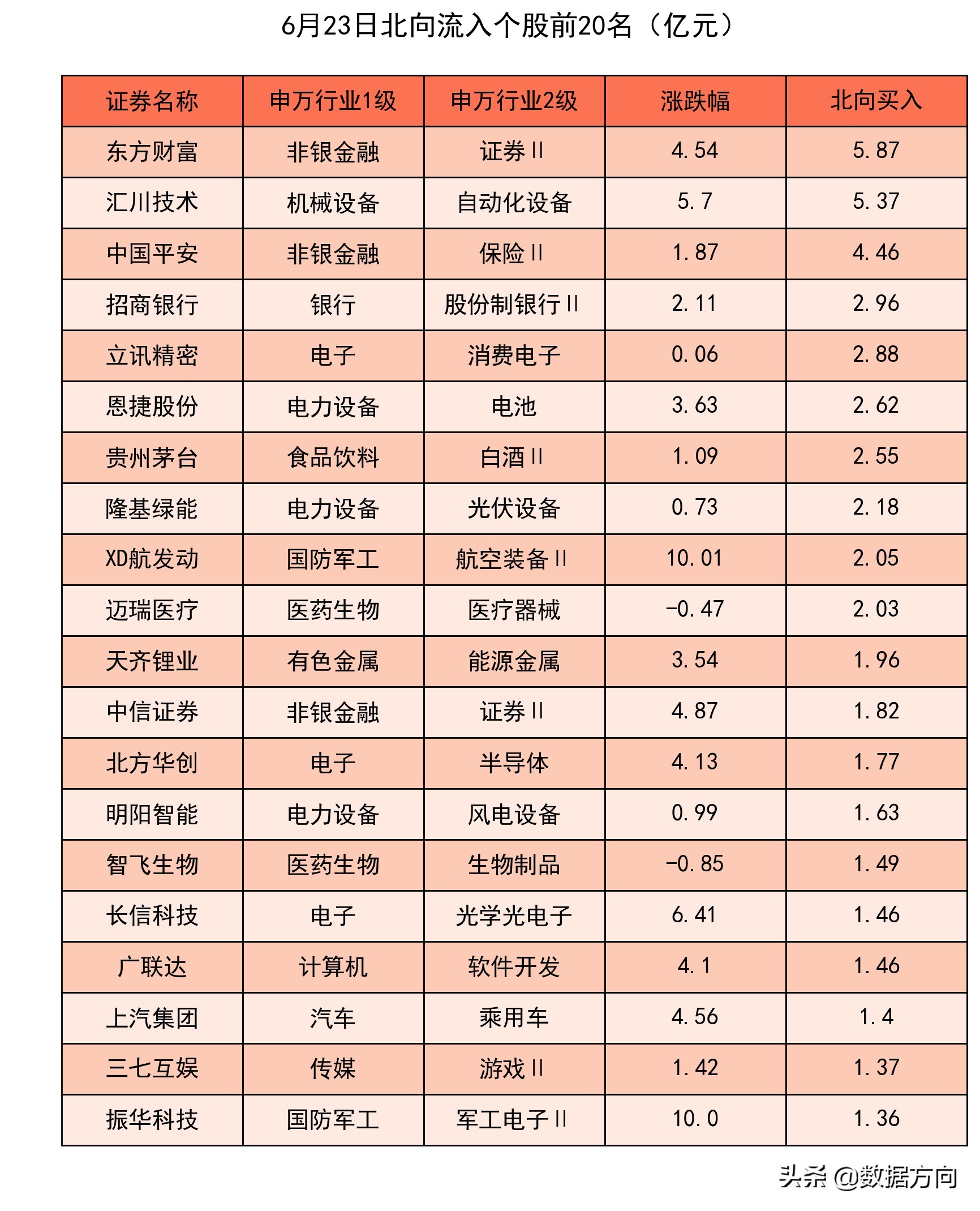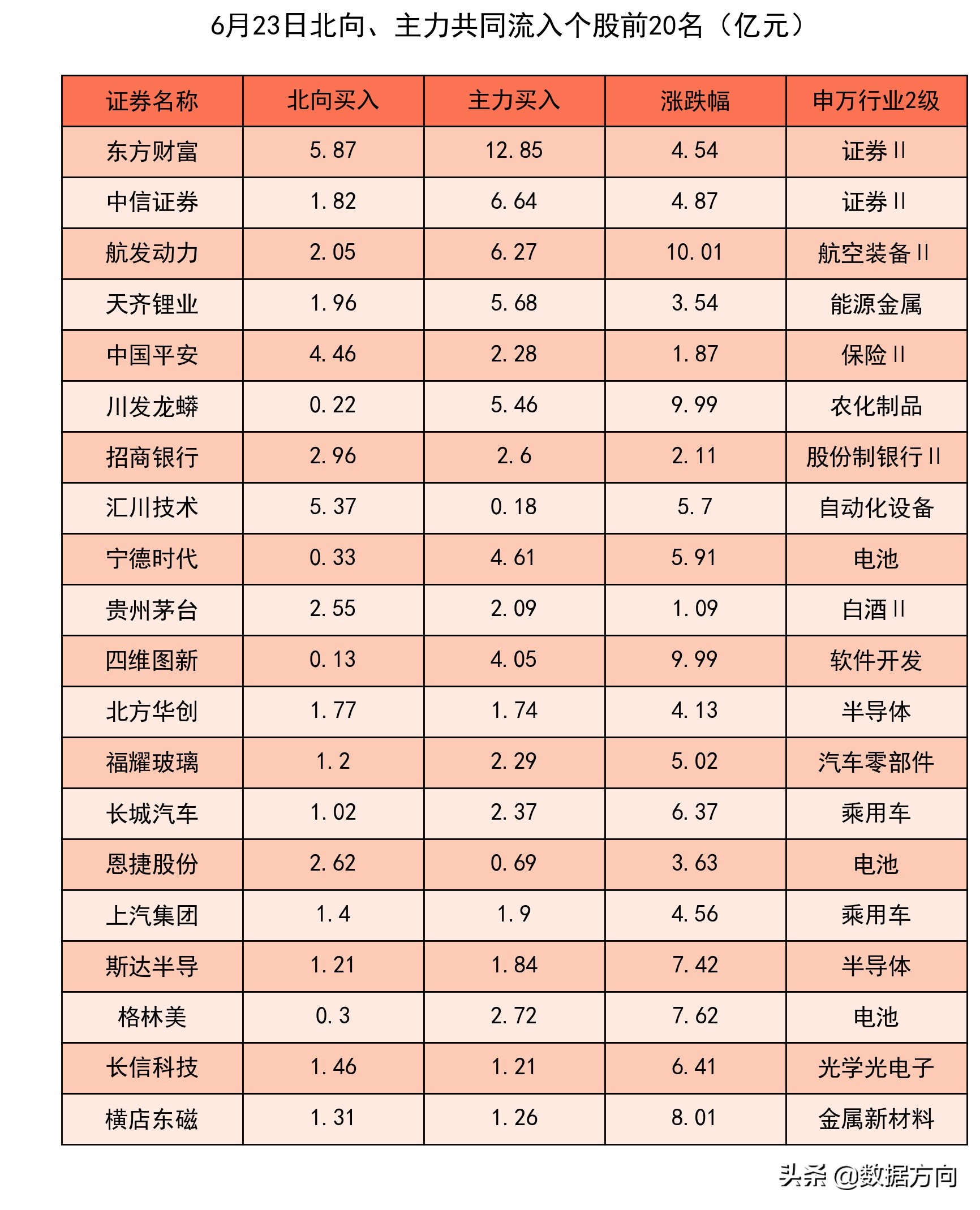 1.6月23日市场资金流向证券、汽车零部件、航空装备、半导体、自动化设备、自动化设备……1.主力和北向共同流入的行业1)证券,主力流入38.71亿,北向流入10.75亿,行业上涨率100.0%,大资金持仓约为标配的101.5%,近4周全部流入;2)汽车零部件,主力流入28.59亿,北向流入5.15亿,行业上涨率97.31%,大资金持仓约为标配的78.16%,近4周全部流入;3)航空装备,主力流入21.7亿,北向流入4.6亿,行业上涨率100.0%,大资金持仓约为标配的116.23%,近4周流入3周;4)半导体,主力流入15.56亿,北向流入10.26亿,行业上涨率97.06%,大资金持仓约为标配的148.32%,近4周流入2周;2.北向买入榜排名靠前的行业5)自动化设备,北向流入7.08亿,行业上涨率88.24%,大资金持仓约为标配的198.62%,近4周全部流入;6)光伏设备,北向流入4.46亿,行业上涨率84.78%,大资金持仓约为标配的141.89%,近4周全部流入;7)军工电子,北向流入4.06亿,行业上涨率100.0%,大资金持仓约为标配的160.44%,近4周流入3周,近2周持续流入;3.主力买入榜排名靠前的行业8)乘用车,主力流入36.29亿,行业上涨率100.0%,大资金持仓约为标配的54.17%,近4周流入2周;9)电池,主力流入19.06亿,行业上涨率93.1%,大资金持仓约为标配的154.54%,近4周流入2周;10)能源金属,主力流入9.29亿,行业上涨率100.0%,大资金持仓约为标配的129.58%,近4周全部流入;4.主力和北向共同流出的行业11)小金属,主力流入-15.64亿,北向流入-2.33亿,行业上涨率84.62%,大资金持仓约为标配的48.93%,近4周流入3周;12)白色家电,主力流入-7.82亿,北向流入-4.52亿,行业上涨率88.89%,大资金持仓约为标配的288.54%,近4周流入3周,近2周持续流入;……