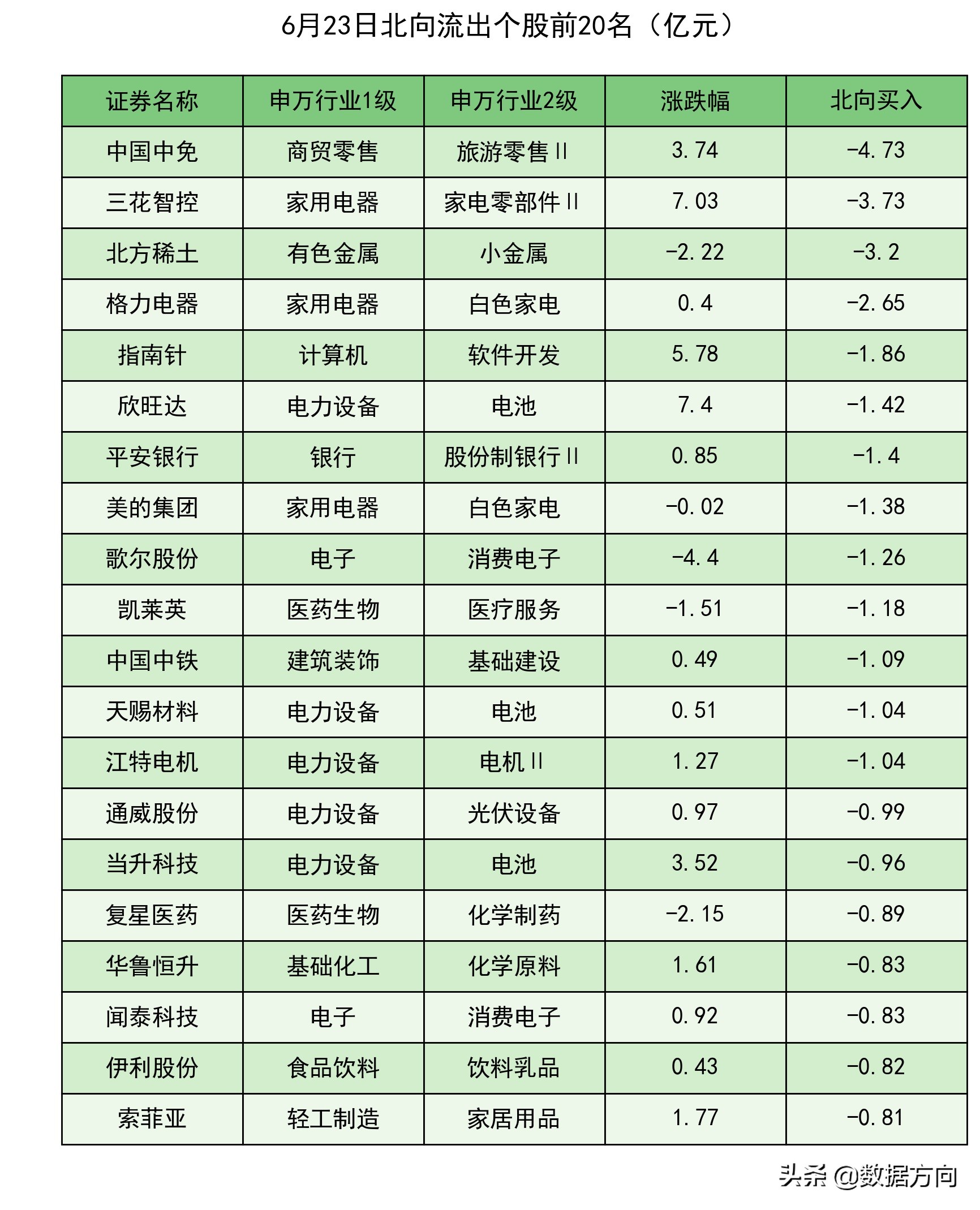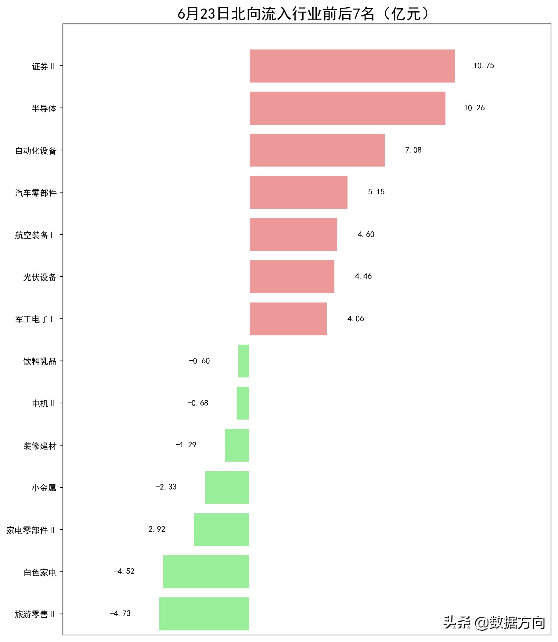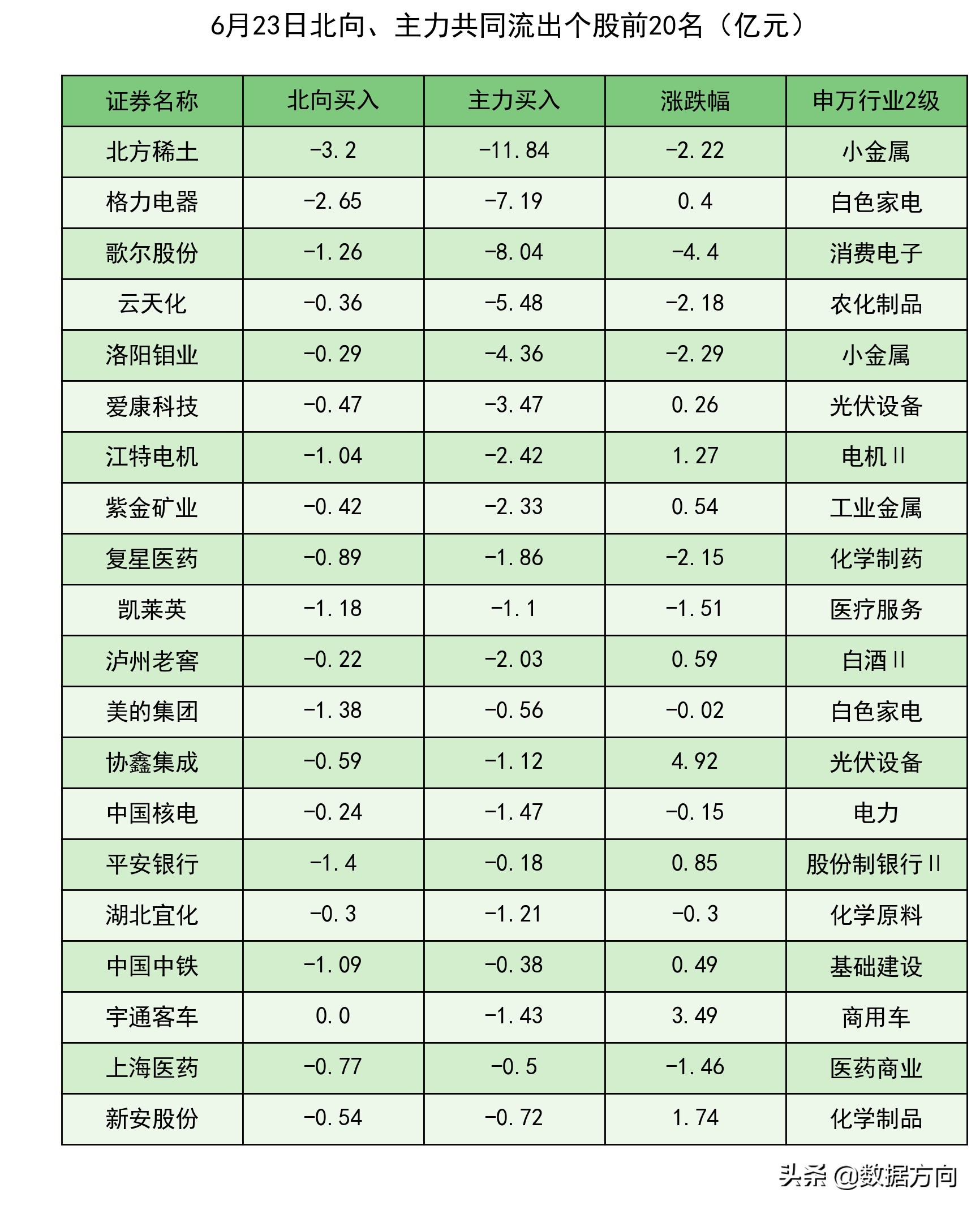 1.6月23日市场资金流向证券、汽车零部件、航空装备、半导体、自动化设备、自动化设备……1.主力和北向共同流入的行业1)证券,主力流入38.71亿,北向流入10.75亿,行业上涨率100.0%,大资金持仓约为标配的101.5%,近4周全部流入;2)汽车零部件,主力流入28.59亿,北向流入5.15亿,行业上涨率97.31%,大资金持仓约为标配的78.16%,近4周全部流入;3)航空装备,主力流入21.7亿,北向流入4.6亿,行业上涨率100.0%,大资金持仓约为标配的116.23%,近4周流入3周;4)半导体,主力流入15.56亿,北向流入10.26亿,行业上涨率97.06%,大资金持仓约为标配的148.32%,近4周流入2周;2.北向买入榜排名靠前的行业5)自动化设备,北向流入7.08亿,行业上涨率88.24%,大资金持仓约为标配的198.62%,近4周全部流入;6)光伏设备,北向流入4.46亿,行业上涨率84.78%,大资金持仓约为标配的141.89%,近4周全部流入;7)军工电子,北向流入4.06亿,行业上涨率100.0%,大资金持仓约为标配的160.44%,近4周流入3周,近2周持续流入;3.主力买入榜排名靠前的行业8)乘用车,主力流入36.29亿,行业上涨率100.0%,大资金持仓约为标配的54.17%,近4周流入2周;9)电池,主力流入19.06亿,行业上涨率93.1%,大资金持仓约为标配的154.54%,近4周流入2周;10)能源金属,主力流入9.29亿,行业上涨率100.0%,大资金持仓约为标配的129.58%,近4周全部流入;4.主力和北向共同流出的行业11)小金属,主力流入-15.64亿,北向流入-2.33亿,行业上涨率84.62%,大资金持仓约为标配的48.93%,近4周流入3周;12)白色家电,主力流入-7.82亿,北向流入-4.52亿,行业上涨率88.89%,大资金持仓约为标配的288.54%,近4周流入3周,近2周持续流入;……