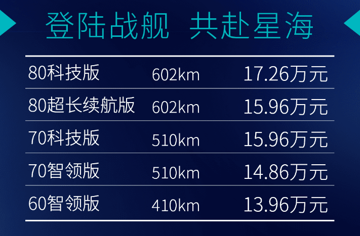 到了80超长续航版车型,主要提升在续航和动力上。这个版本的车型拥有同级更高的602km续航里程,配备165kW、350N·m超高功率电机,可实现零百加速6.8秒。