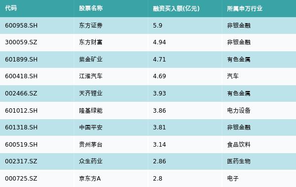6.1月9日,两市共有3107只个股有融资资金买入,其中东方证券、东方财富、紫金矿业排名前三,买入金额分别5.9亿元、4.94亿元、4.71亿元。