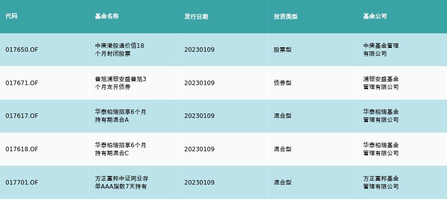 7.融资买入额前10个股详情见下表:三、基金发行情况1月9日,有5只新基金发行,分别为:中庚港股通价值18个月封闭股票、普旭浦银安盛普旭3个月定开债券、华泰柏瑞招享6个月持有期混合A、华泰柏瑞招享6个月持有期混合C、方正富邦中证同业存单AAA指数7天持有,详情见下表:四、龙虎榜情况1月9日,龙虎榜营业部净买入额前10详情见下表:更多内容请下载21财经APP