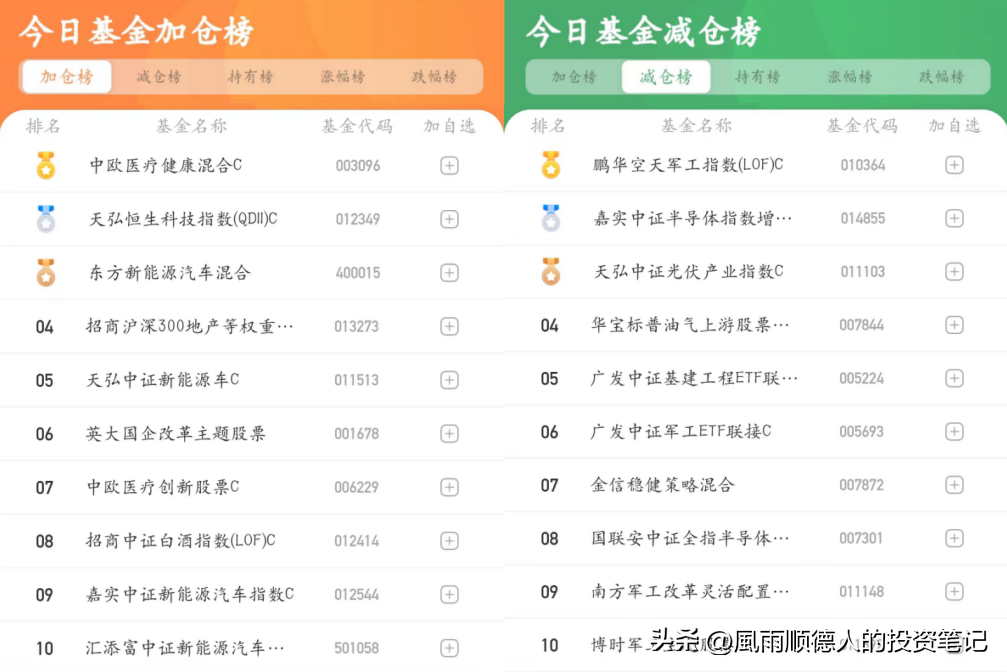 本交易日大数据统计增仓前10的基金分别是:中欧医疗健康混合C、天弘恒生科技指数(QDII)C、东方新能源汽车混合、招商沪深300地产等权重指数C、天弘中证新能源车C、英大国企改革主题股票、中欧医疗创新股票C、招商中证白酒指数(LOF)C、嘉实中证新能源汽车指数C、汇添富中证新能源汽车产业指数(LOF)C;