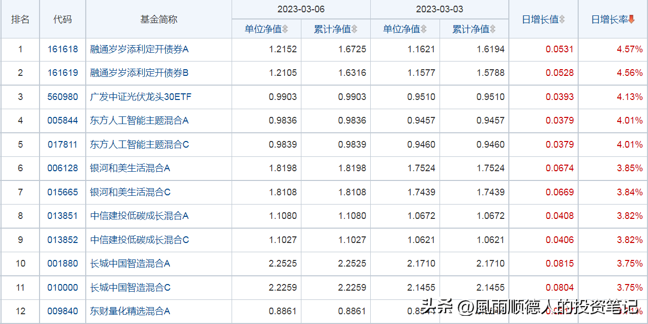 6日开放式基金净值增长排名前10的基金分别是:融通岁岁添利定开债券A、融通岁岁添利定开债券B、广发中证光伏龙头30ETF、东方人工智能主题混合A、东方人工智能主题混合C、银河和美生活混合A、银河和美生活混合C、中信建投低碳成长混合A、中信建投低碳成长混合C、长城中国智造混合A、长城中国智造混合C、东财量化精选混合A。