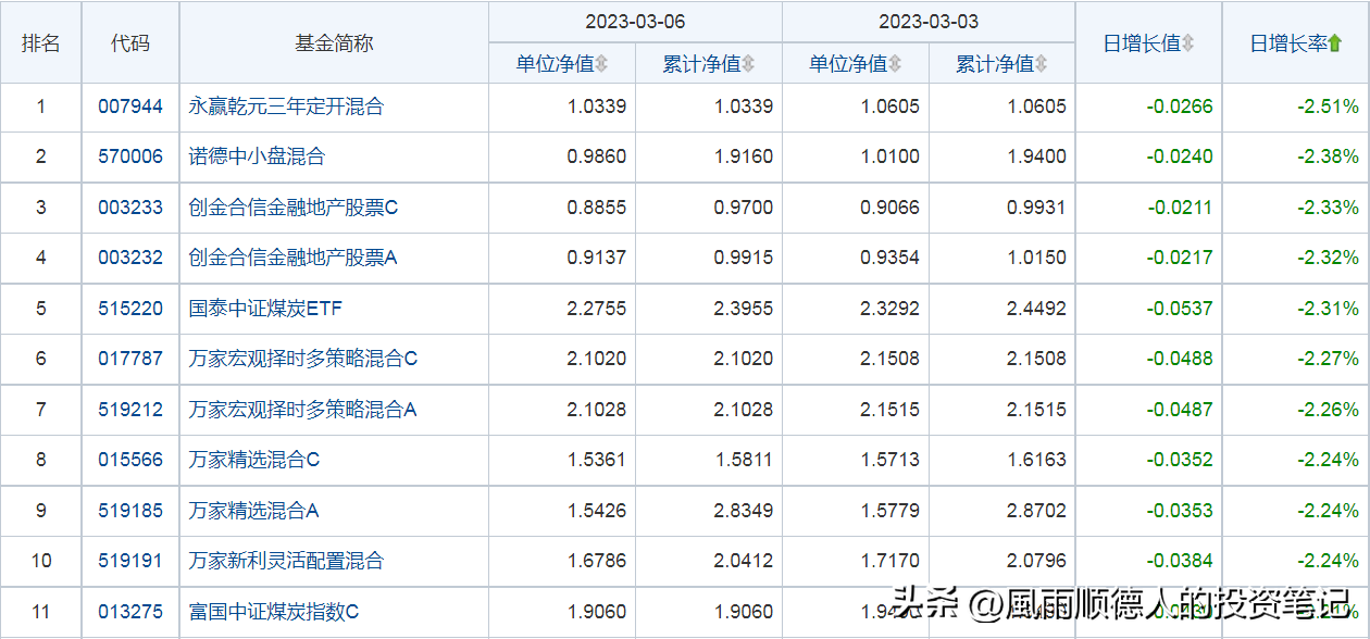 6日开放式基金净值增长排名后10的基金分别是:永赢乾元三年定开混合、诺德中小盘混合、创金合信金融地产股票C、创金合信金融地产股票A、国泰中证煤炭ETF、万家宏观择时多策略混合C、万家宏观择时多策略混合A、万家精选混合C、万家精选混合A、万家新利灵活配置混合、富国中证煤炭指数C。