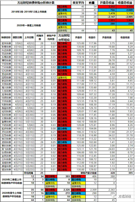 2020年上市(含2019申购2020上市)转债,方远财经转债申购各评级收益:强力申购平均收益2326元,平均单账户每支35;量力申购平均收益272元,平均单账户每支17;谨慎申购平均收益10元,平均单账户每支10;放弃申购平均收益44元,平均单账户每支44。