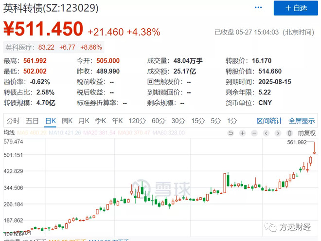 今天转债市场终于又有转债收盘站上500元,英科转债盘中最高561元,收盘价511元。与其他二三百妖债动辄100%以上溢价率不同的是,英科转债略微折价,站上500元靠的是正股英科医疗在今年上涨超过3倍。英科转债收盘站上500元尽管是个例,但给转债打开了高价格的天花板。转债市场进入大时代,几百支转债会百花齐放,未来可能会有转债价格比肩茅台,可能也会有转债违约暴雷,考验的是每个投资人的投资能力和投资系统。