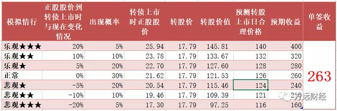 目前转债上市时间平均25天,慢的可能要1个多月。在此期间正股情况会发生波动,模拟不同情形,测算单签预期收益为263元,中签0.2签,预期单账户收益52元。