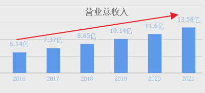 从增长幅度来看,公司营收从2016年的6.14个亿,增长到了2021年的13.58个亿,增长幅度为121%。