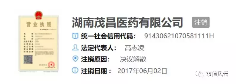 下面更诡异的事情又开始了:我们再来看2016年,湖南茂昌医药对科伦的销售额又突然从15年的5.6亿暴跌到2.78亿,即恢复到湖南五田以往正常的销售水平。而在2017年6月2日 ,湖南茂昌医药突然注销了。