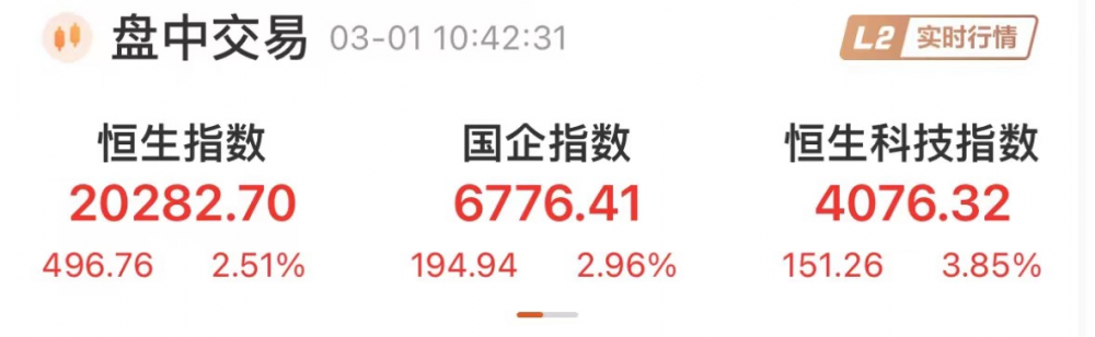 1.今日(3月1日),港股集体上涨,直线拉升,截至发稿,恒生科技指数涨近4%,恒生指数涨超2%。