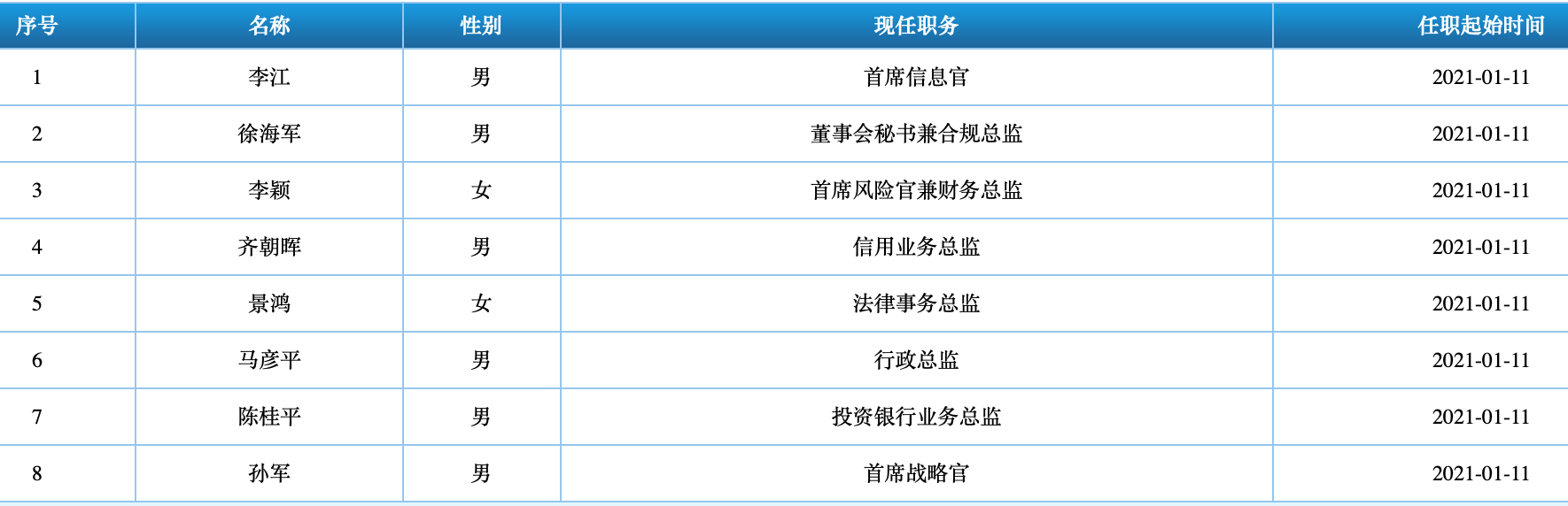 中证协披露信息显示,目前渤海证券高管团队共8人,起任时间均为2021年1月11日。另外,记者从渤海证券官网获悉,2021年7月起,渤海证券聘任李辉为公司副总裁。根据履历显示,李辉上一份就职为:2016年6月至2021年6月任中泰证券(上海)资产管理有限公司总裁助理。