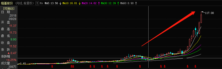 从股价走势看,隆基股份在2018年三季度时,股价在9月至19元区间震荡。到去年一季度时,隆基股份当时股价最高才涨到35.02元。从去年5月份开始,隆基股份股价开始拉升,并不断突破新高,直到股价破百。