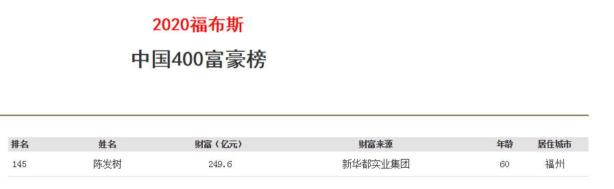 据2020福布斯中国富豪榜显示,陈发树个人财富达249.6亿元,排名第145位。