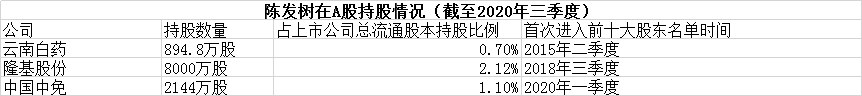 据不完全数据统计,陈发树近年抓住了三只牛股,分别是隆基股份、中国中免、云南白药。