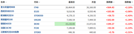 欧股涨幅扩大,意大利富时MIB指数、西班牙IBEX35指数涨超2%,德国DAX30指数、欧洲斯托克50指数涨约1.4%,法国CAC40指数涨1.3%。