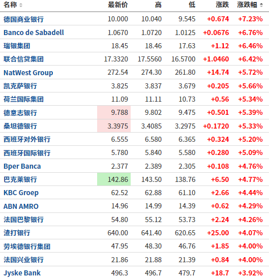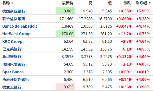 银行股指数涨近2%,个股普遍上涨,联合信贷集团、德国商业银行涨超5%,巴莱克银行、法国巴黎银行等多家银行涨超4%,瑞银涨逾3%。