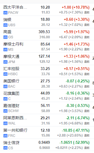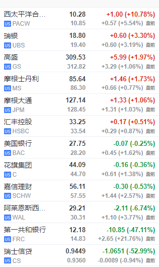 美股盘前,银行股多数上涨,第一共和银行涨逾21%,西太平洋合众银行涨逾5%,瑞银涨逾3%,瑞信跌近1%。