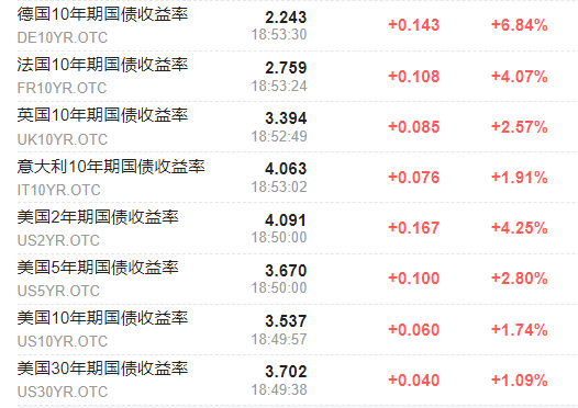 欧美债市持续下行,美国2年期国债收益率日内上行17个基点,10年期国债收益率上行6个基点;德国10年期国债收益率日内上行14个基点,法国、英国10年期国债收益率上行10个基点左右。