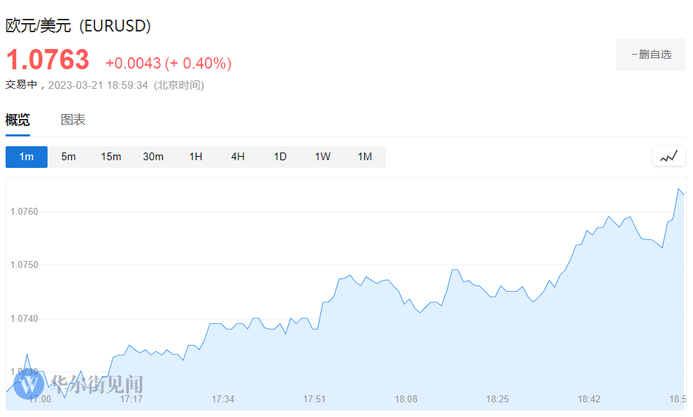 美元指数小幅下行,欧元兑美元涨0.4%至1.0764,创2月14日以来新高。