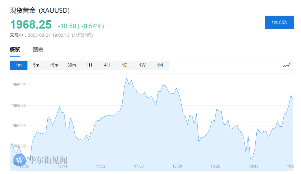 黄金持续震荡,日内跌幅为0.5%,现报1968.25美元/盎司。