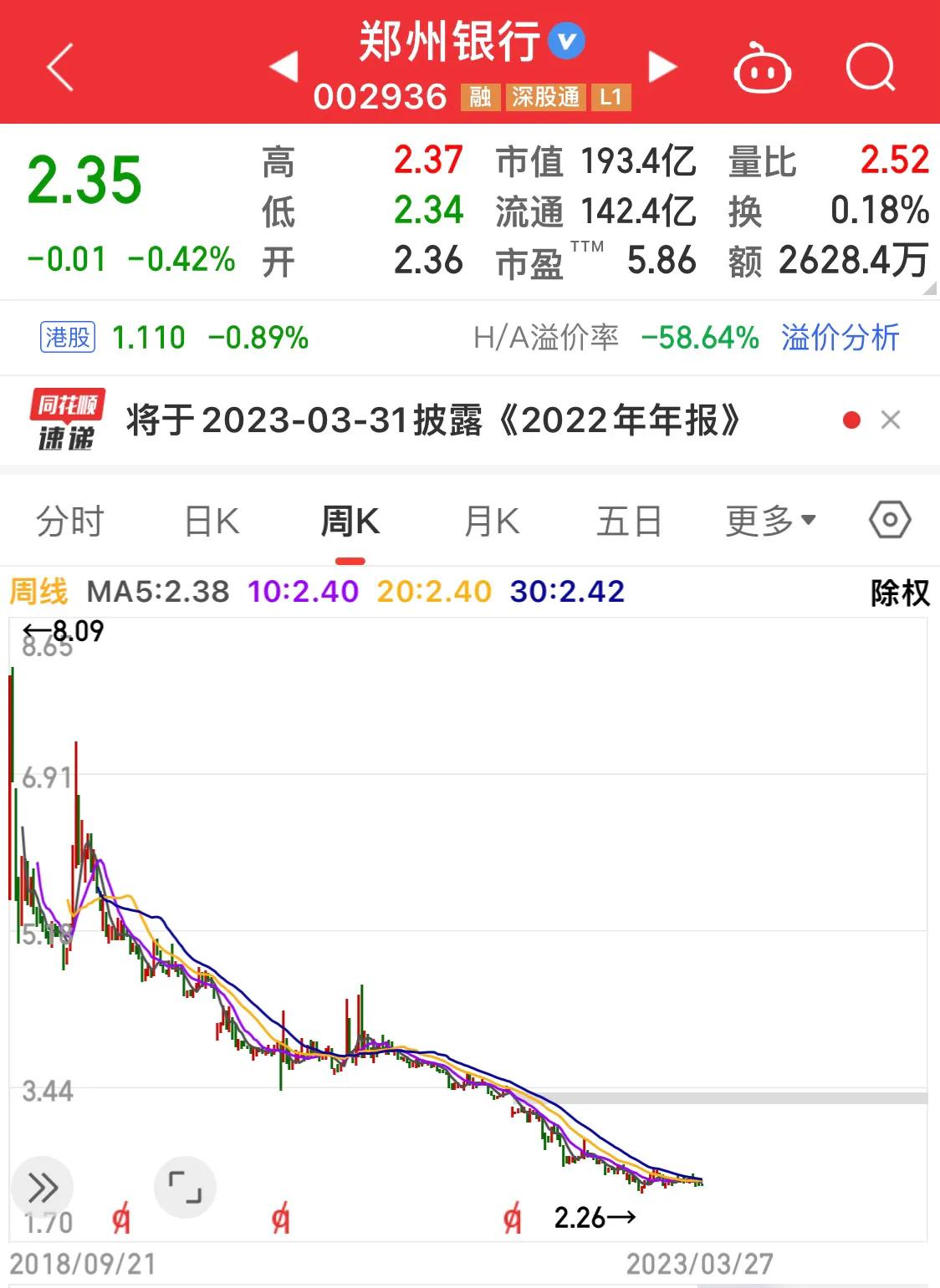 5.郑州银行2018年9月上市,股价高点8.09元,月线2019年3月7.27,2020年12月4.46,就出现过这么两次短时上涨,现股价2.36,高点下来跌了71%,郑州银行做到了银行股跌起来不比小盘股概念股逊色