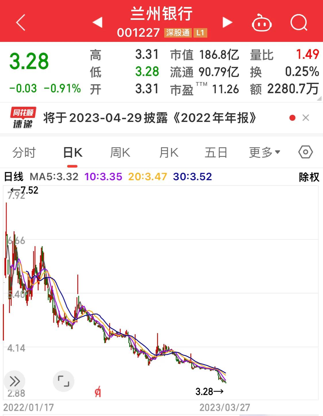 7.兰州银行2022年1月上市,股价高点7.52,当时上市以为要跌破发行价,结果因为流通股少被游资炒了一番,不知道现在是价值回归还是股票太多,投资者选得眼花缭乱而忽略了银行股