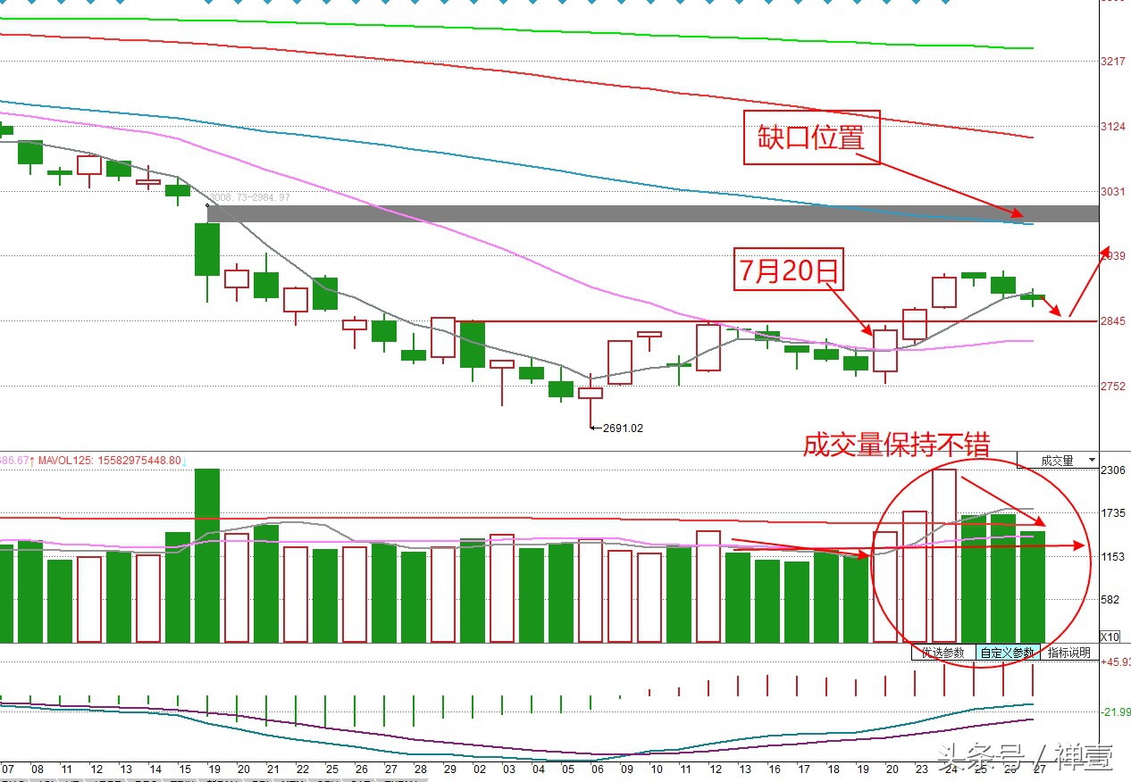 从沪指日K线图看,7月20日的反弹前,还有3个中阳线,只有7月20日的中阳线出现后,我告诉大家反弹可能就此展开。为什么?就是因为出现了明显 的阶段性的底部形态,第二第三个中阳线后的强势洗盘,MACD金叉且一直翻红。这些技术,我都曾经教给过大家,可惜能认真记忆,细心领悟的人有多少呢?