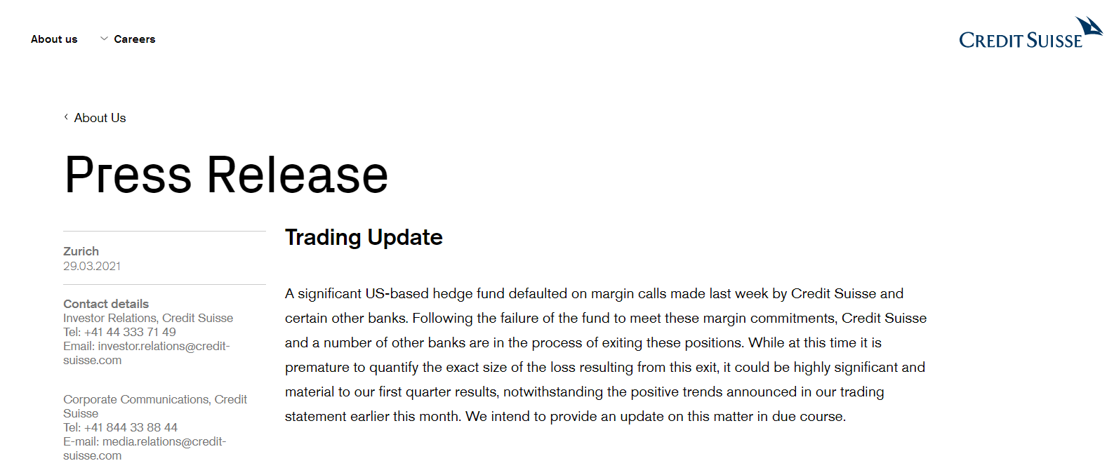 在开盘前几小时,瑞信发布声明称,一家总部位于美国的大型对冲基金未能履行瑞信和某些其他银行上周发出的追加保证金要求。由此,瑞信和其他一些银行正在退出相关头寸。