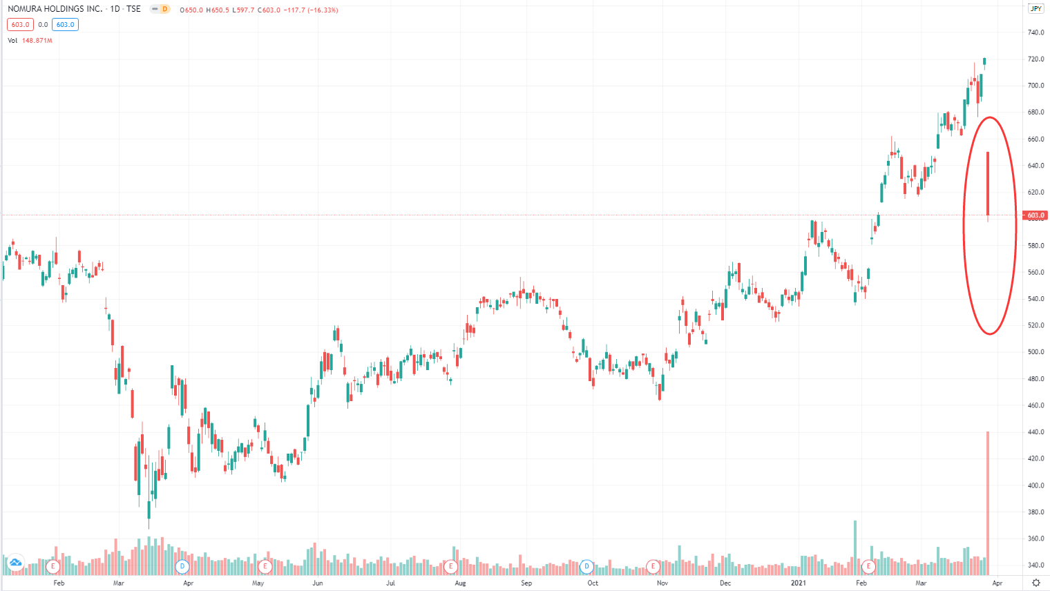 该事件正式被媒体曝光后的第一个工作日(3月29日),事件的主角——Tengyue和Bill Hwang的Archegos Capital的经纪商们“殃及池鱼”,股价暴跌。其中,相关亏损规模初步预计高达20亿美元的野村股价跌得最惨,创出了上市以来的最大跌幅。