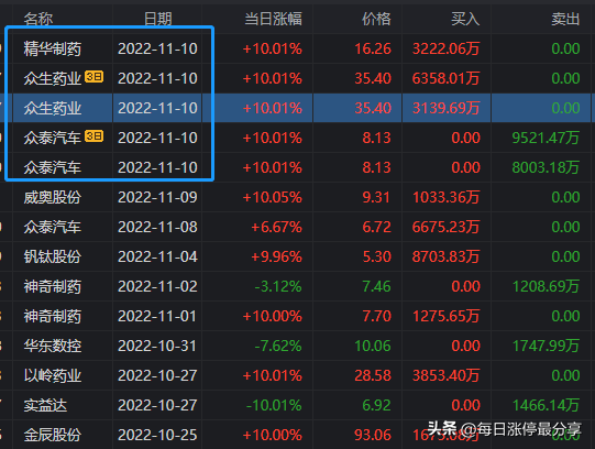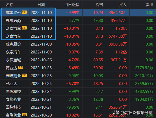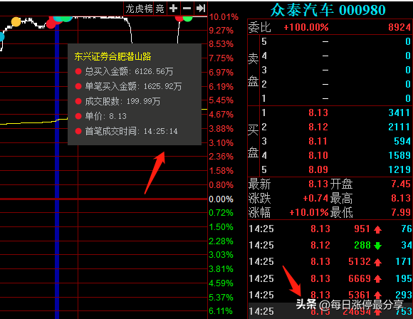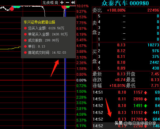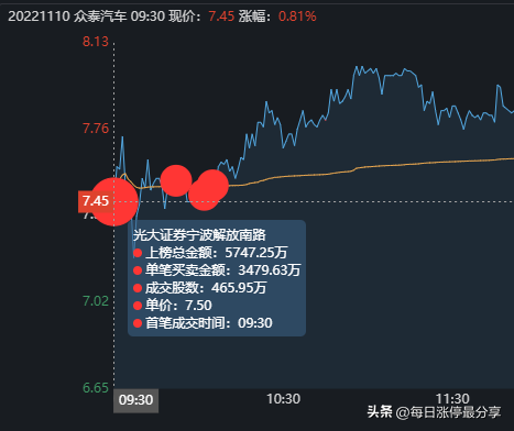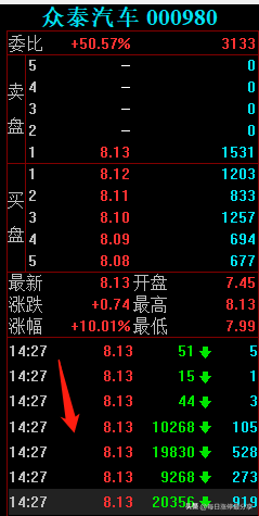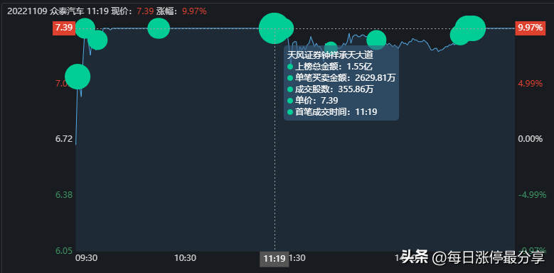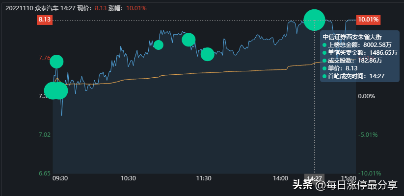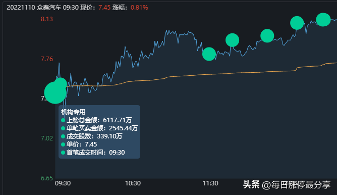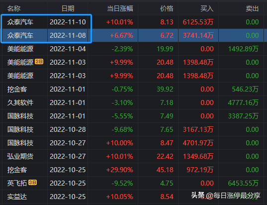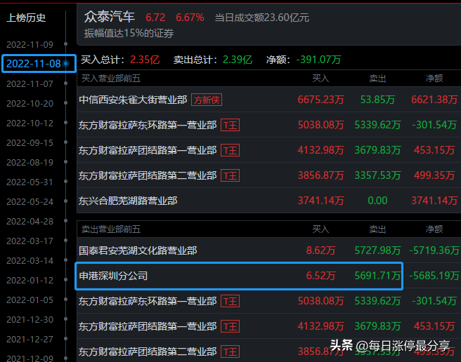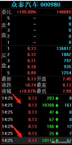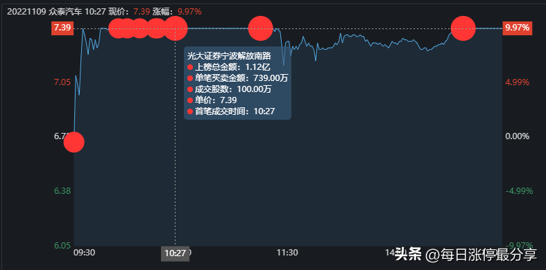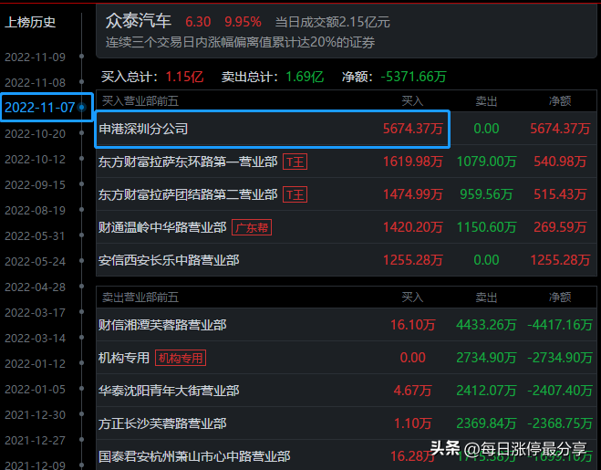 11.7日周一,众泰汽车一字板涨停,最大的特点是申港深圳来接了5674万。
