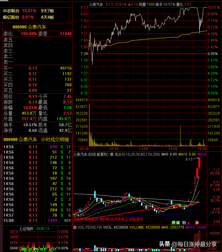 众泰汽车,流通市值348亿,全天成交了35.12亿,换手率10.57%。