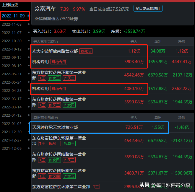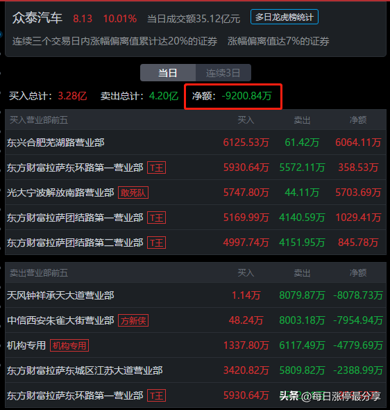 这个席位,前面周二已经布局了众泰汽车3741万,周三没有上榜,周四加仓了6125万。