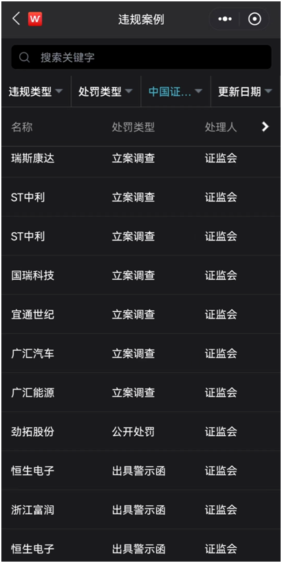 11月以来,惠程科技、模塑科技、梦洁股份、瑞斯康达、康隆达、江苏舜天、国瑞科技、ST华英、ST中利、*ST未来等上市公司接连被证监会立案,且皆因涉嫌信息披露违法违规,被实施风险警示的公司更是成了重点对象。