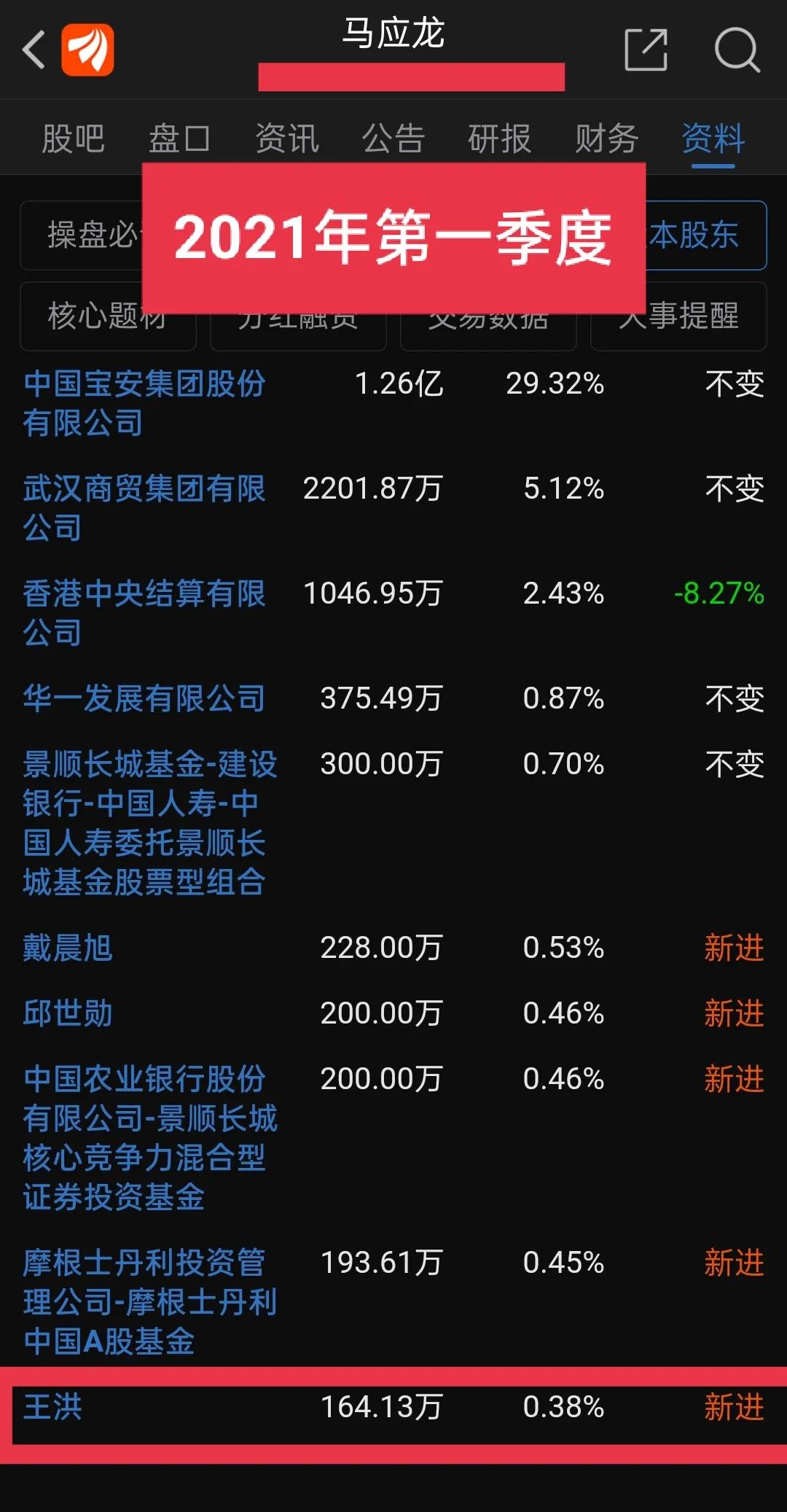 在持股那段时间里,让我兴奋的是,在2021年的第一季度中的十大流通股东中,我发现了“王洪”这个名字。