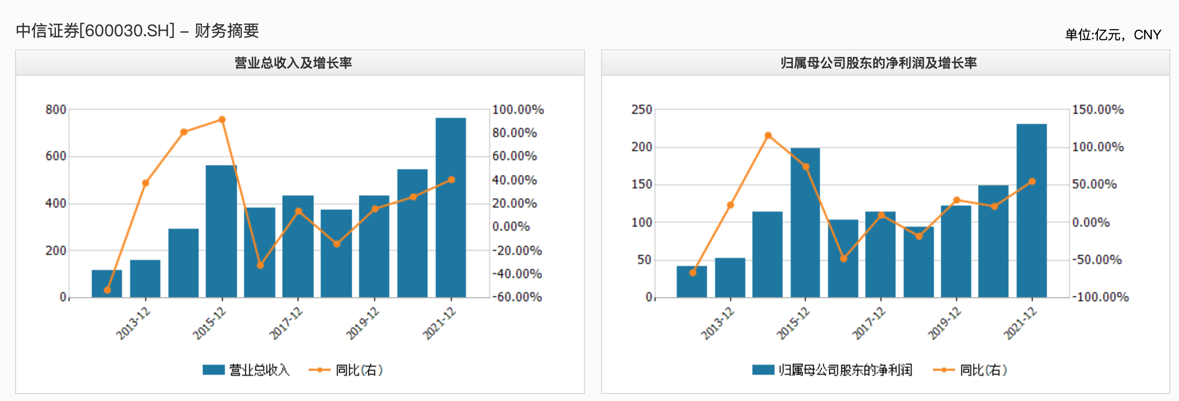 2016-2021年,中信证券的业绩波动起伏,在经过2016年和2018年的下滑后,营收迎来爆发。时隔6年,中信证券的营收再次攀登高峰并创下了新的纪录,2021年,中信证券实现营收765.24 亿元,同比增长 40.71%。