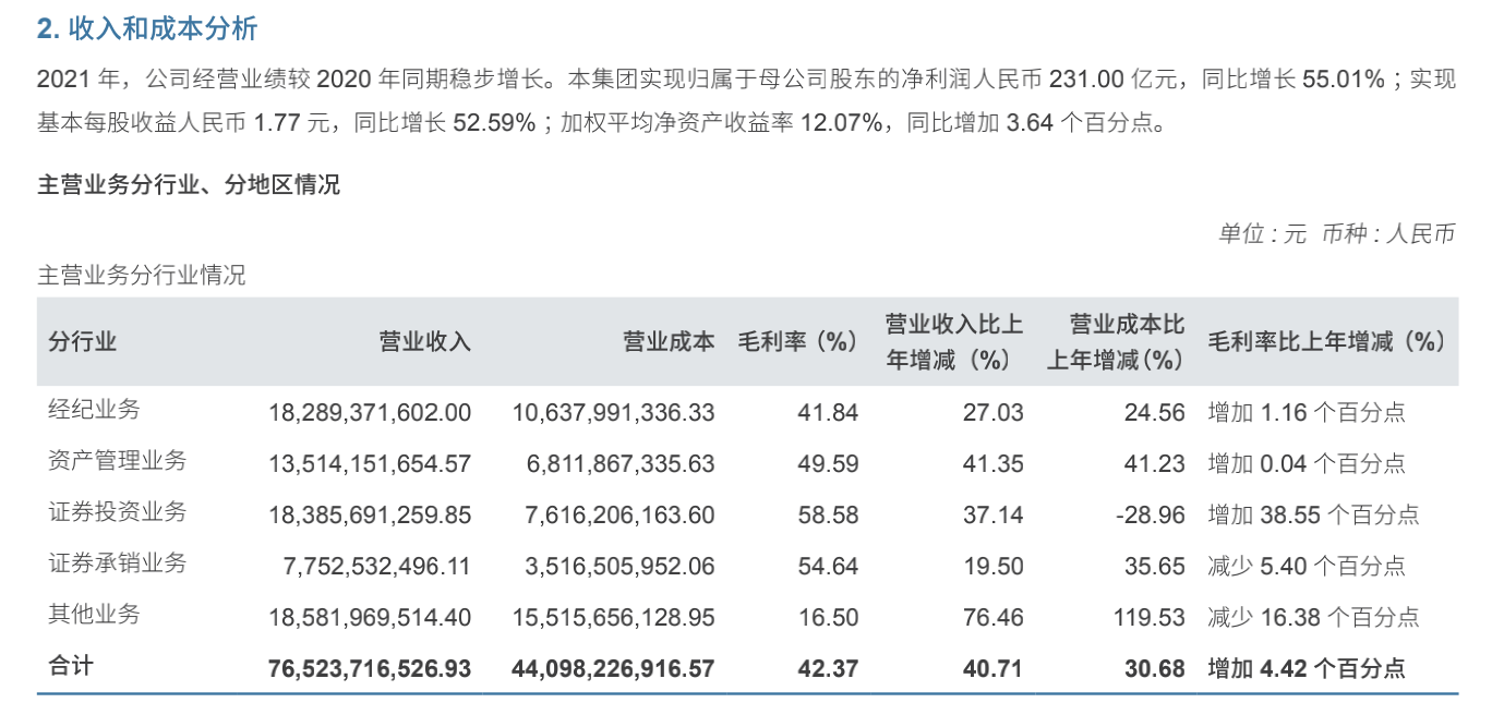 从业务发展来看,2021年,中信证券的各项业务依然是全面开花,证券投资业务、经纪业务和资管业务分别实现营收183.86亿元、182.89亿元和135.14亿元,其中,投行业务营收超过了最为传统的经纪业务。与此同时,证券投资业务毛利率为58.58%,证券承销业务和资管业务毛利率次之,分别达到54.64%、49.59%。