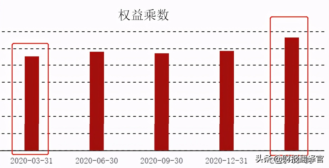 最后我们再来看一个对公司盈利能力有影响的指标-权益乘数。权益乘数是企业使用借款做生意的财务杠杆倍数,就像炒股票配资一样,企业也会向银行借款做买卖。所以,这个数值越大,说明企业使用的财务杠杆越大。