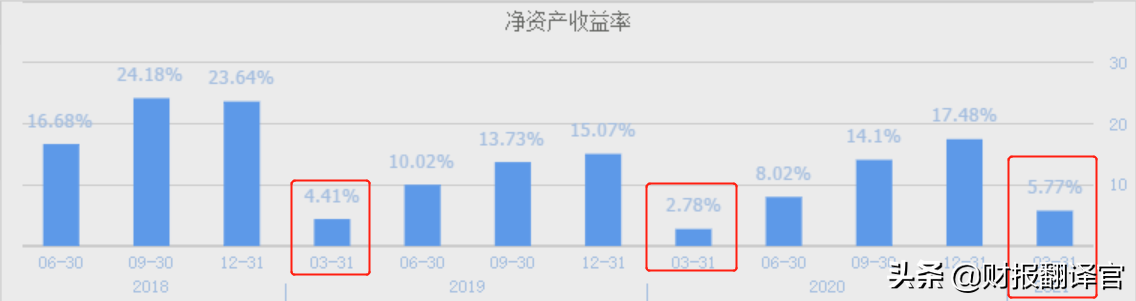 唯一的亮点是,公司一季度的盈利能力,也就是净资产收益率出现了上涨。不仅比去年一季度的盈利能力要强,甚至比2019年一季度的盈利能力还要强。